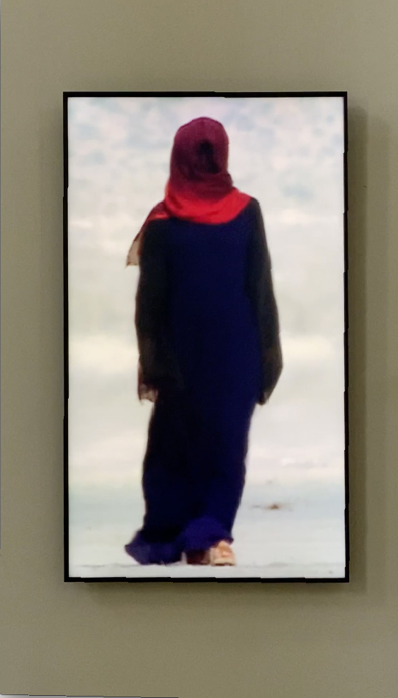 Pour méditer, on peut s’appuyer sur un support visuel à fixer. C’est la fonction des icônes. Dans « Passage into Night », Bill Viola utilise un autre registre, l’image vibrante, imprécise, celle du mirage qui nous intrigue tant. La femme en sombre marche d’un pas normal, mais sa silhouette instable en permanence, jamais la même, fascine comme les flammes d’un feu. Intrigante, hypnotique, mais jamais inquiétante. Le temps s’étire, on comprend vite qu’il n’y a pas de narration, on attend une fin, on l’imagine. Puis, la silhouette envahit l’écran et semble accélérer le temps, jusqu’à la fin, l’image donnant le sens du titre de l’œuvre, avant le redémarrage de la boucle. Au temps linéaire, le rythme des pas, succède un temps cyclique, celui de la vidéo.