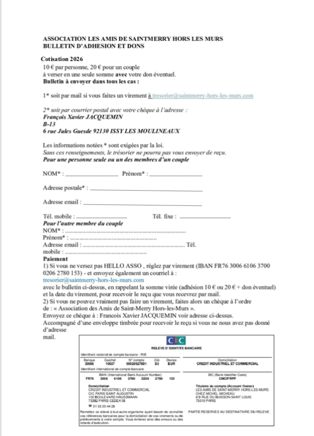 - Soit vous faites un virement et vous adressez le bulletin par mail en pièce jointe à : tresorier@saintmerry-hors-les-murs.com